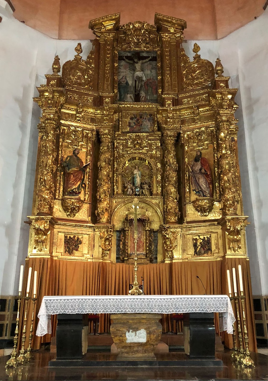 Pudimos ver también en esta iglesia ruinosa, en la misma visita, un pequeño retablo neoclásico de madera, seguramente el "altar del Rosario" fechado en los primeros años del siglo XIX "dorado y jaspeado" en 1843.
