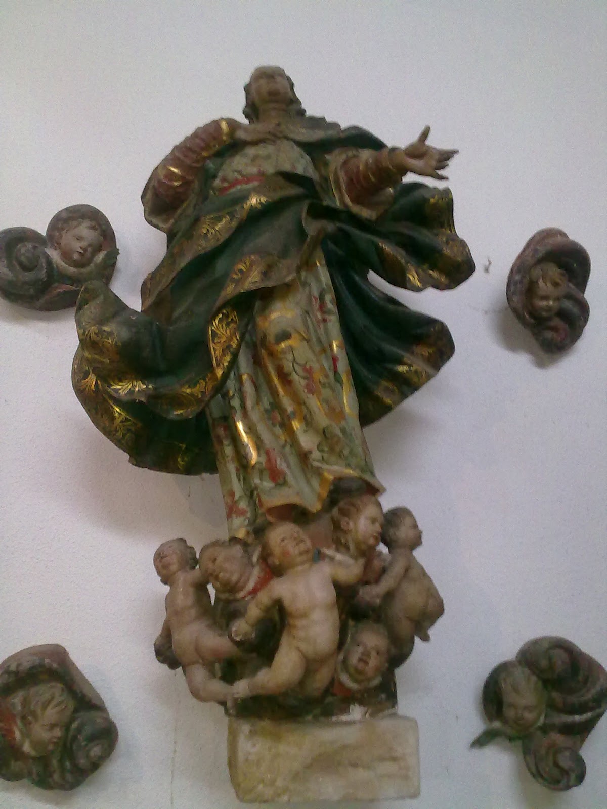 Imagen de rostro expresivo y buena talla, que preside el frontis de la capilla, desde el arco de la portada medieval. Procede de la iglesia derrumbada. Fechable entre el último renacimiento y el primer barroco.